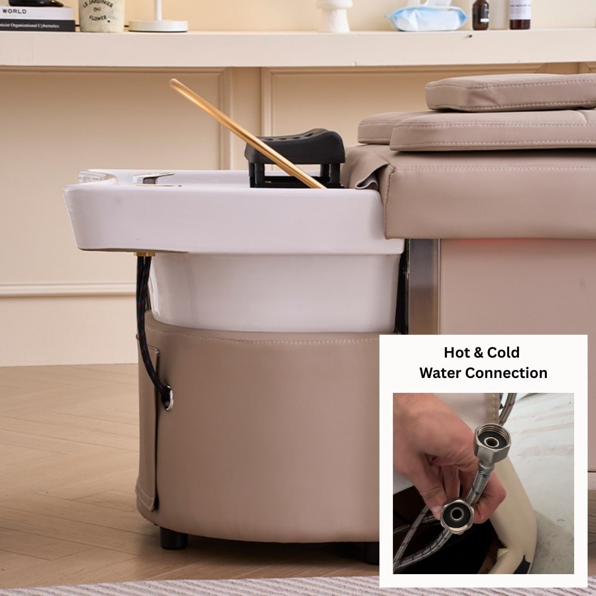 Onze headspa is voorzien van een hoogwaardige keramische wasbak die niet alleen luxueus oogt, maar ook uiterst duurzaam en eenvoudig te reinigen is, zelfs bij intensief gebruik zoals het uitwassen van haarkleuringen.
